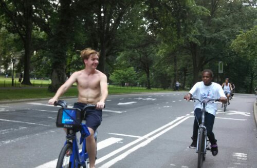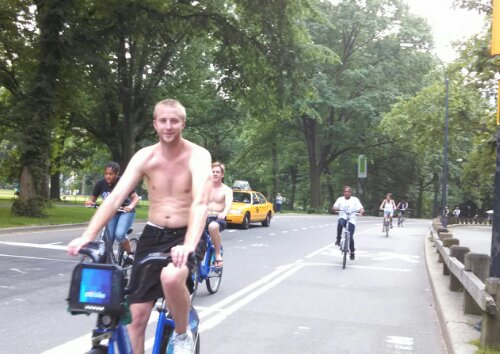 We swapped bikes right outside of Central Park. This was MY thing to do in New York. I’d been to the city several times before, but never got to see the famous Central Park. Honestly, I still haven’t seen it. We stayed only on the main road, pedaling as fast as we could to get through the park. We didn’t stop. Not once. Not at the zoo, not at the lake (or pond, how would I know?),not to stroll around. Bupkis. After fifteen minutes of speed biking we had to do an about-face and head back for the bike port. We did get some pictures though. The boys were shirtless. Again.