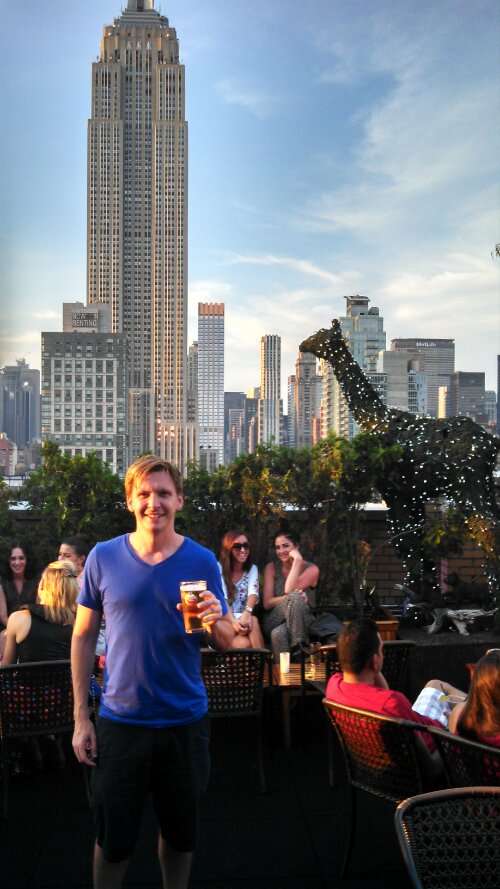 The sun was sinking lower in the sky, and we knew our day was almost up. We decided to do one last fun thing in the city, and I suggested (surprise, surprise) getting a drink. The fun part was that it had to be a rooftop bar! We sat in Zucotti park, googled where we could find such a treasure, and then we plotted our course. Our leg muscles laughed out loud at the suggestion of biking again, so we decided to take the subway, which was something Gabe had always wanted to do. As it was his first time, unfortunately, he wasn’t used to the rotating gate system that only lets one person through at a time, then locks back into place. Gabe got his MetroCard right as the train was approaching, then pushed the gate until it clicked…without him ending up on our side. The train came and went, emotions ran high, and Alina went to talk to the security guard, who buzzed Gabe through the normal door. He was a little embarrassed, but in another five minutes we were on our way. We hugged Alina goodbye on stop before ours. It was so sweet of her to come meet us, and great to see family I don’t get the chance to spend time with very often.