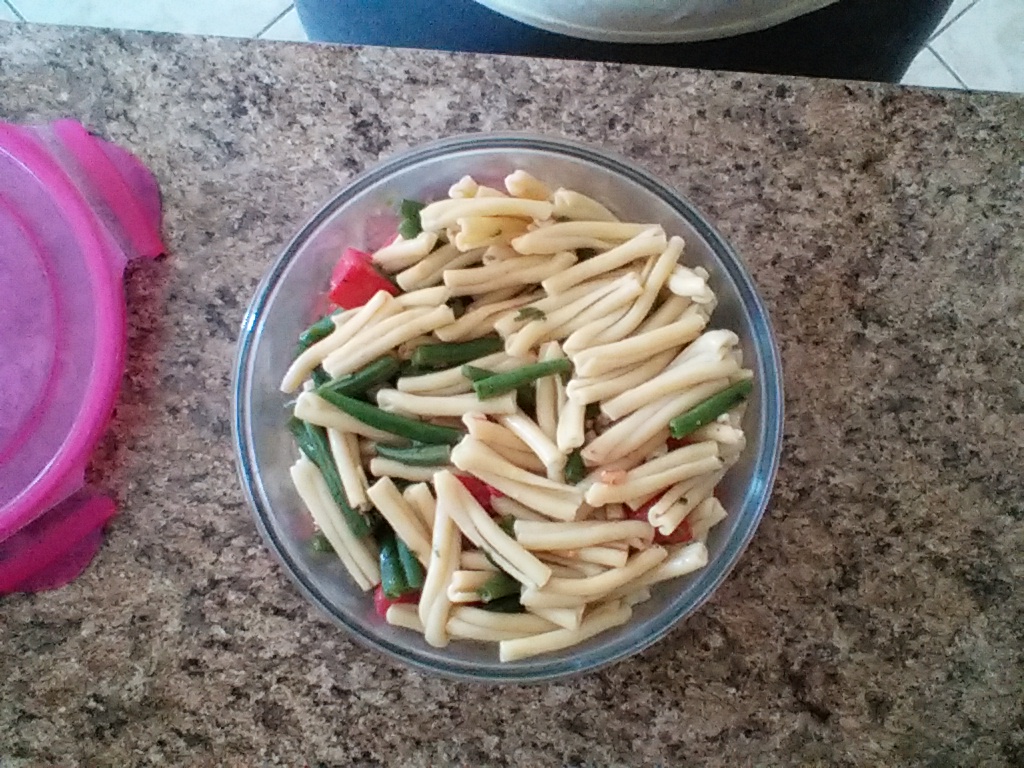 Delicious wheat pasta with a basil -olive oil coating, green beans, and tomato. I will definitely make this again .