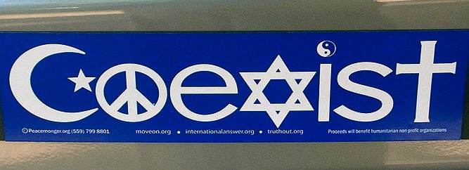 You’ve probably seen the navy blue bumper stickers with the word “Co-exist” on them. They work little symbols for Judaism, Islam, and Christianity into the word with a cross for the “t”, a star of David for the “o” and the crescent moon for the “c”.