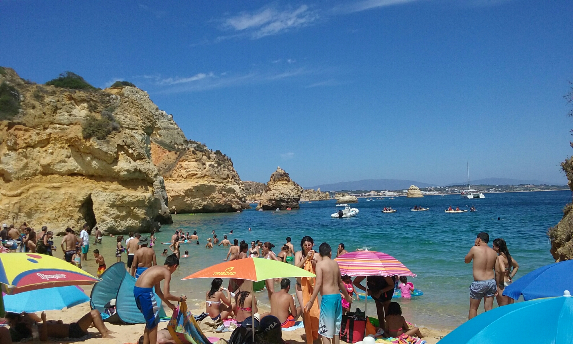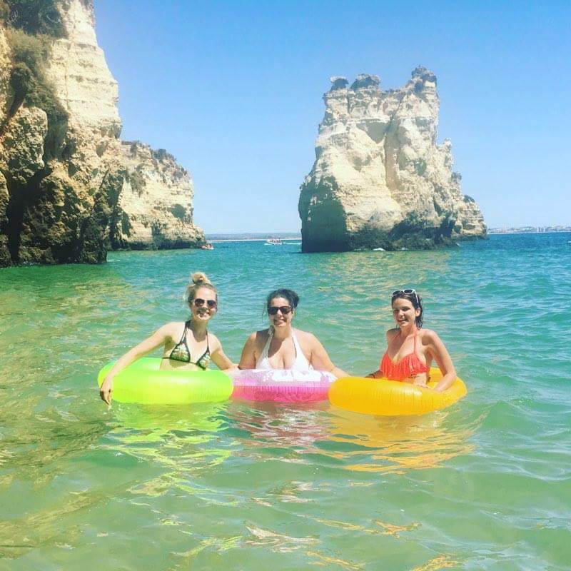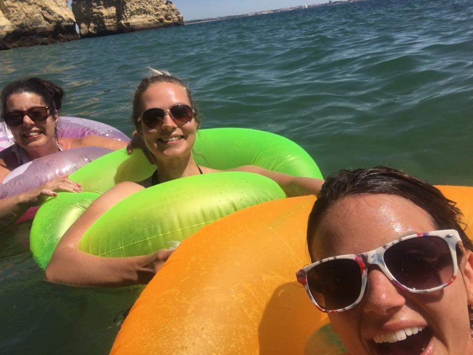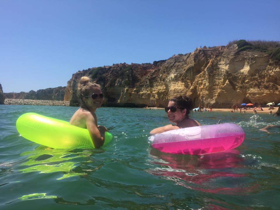 Thursday morning we grabbed our tubes and headed towards Praia de Pinhao. As beautiful as Camilo had been, we wanted to see as many of the beaches as possible. We laid our towels out as far back as possible because we’d learned the day before that the tide comes in very swiftly and your stuff will get soaked or swept away if you’re not careful! We blew up our tubes (well, AshCap blew up mine. I was still working on the trademark sandwich I made each day in Lagos: tomato, fresh mozzarella, and pesto on a freshly baked artisan roll. Perfection.).