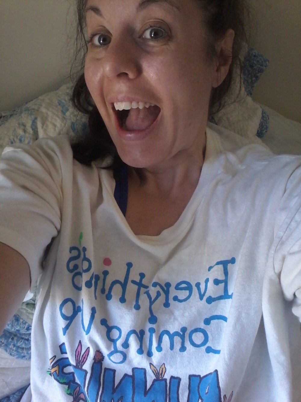 I look homeless. I’m wearing fuzzy purple socks and an Easter-themed “Everything’s Coming up Bunnies”t-shirt. My hair falls somewhere between frizzy and sleepwalking.