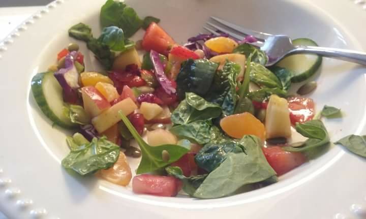 For lunch, I have a whole-food veggie burger. I chop carrots, tomatoes, onions, and bright yellow peppers, add them to organic mixed green baby lettuce, and drizzle on my homemade, oil-free balsamic vinaigrette.