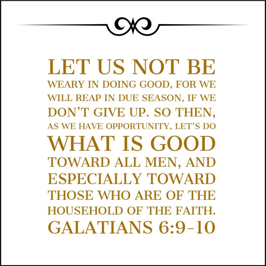 We need to do that, too. We start in the family of believers, as Galatians 6:10 instructs us. How beautiful it is when the church functions as an actual family, helping one another whenever a need arises. Meal trains for new mamas, paying bills for someone who’s lost their job, babysitting, helping each other with big projects, not pretending you’re dead when someone needs help moving. It’s so great to have a group of people you can depend on, no matter what, through life’s ups and downs.