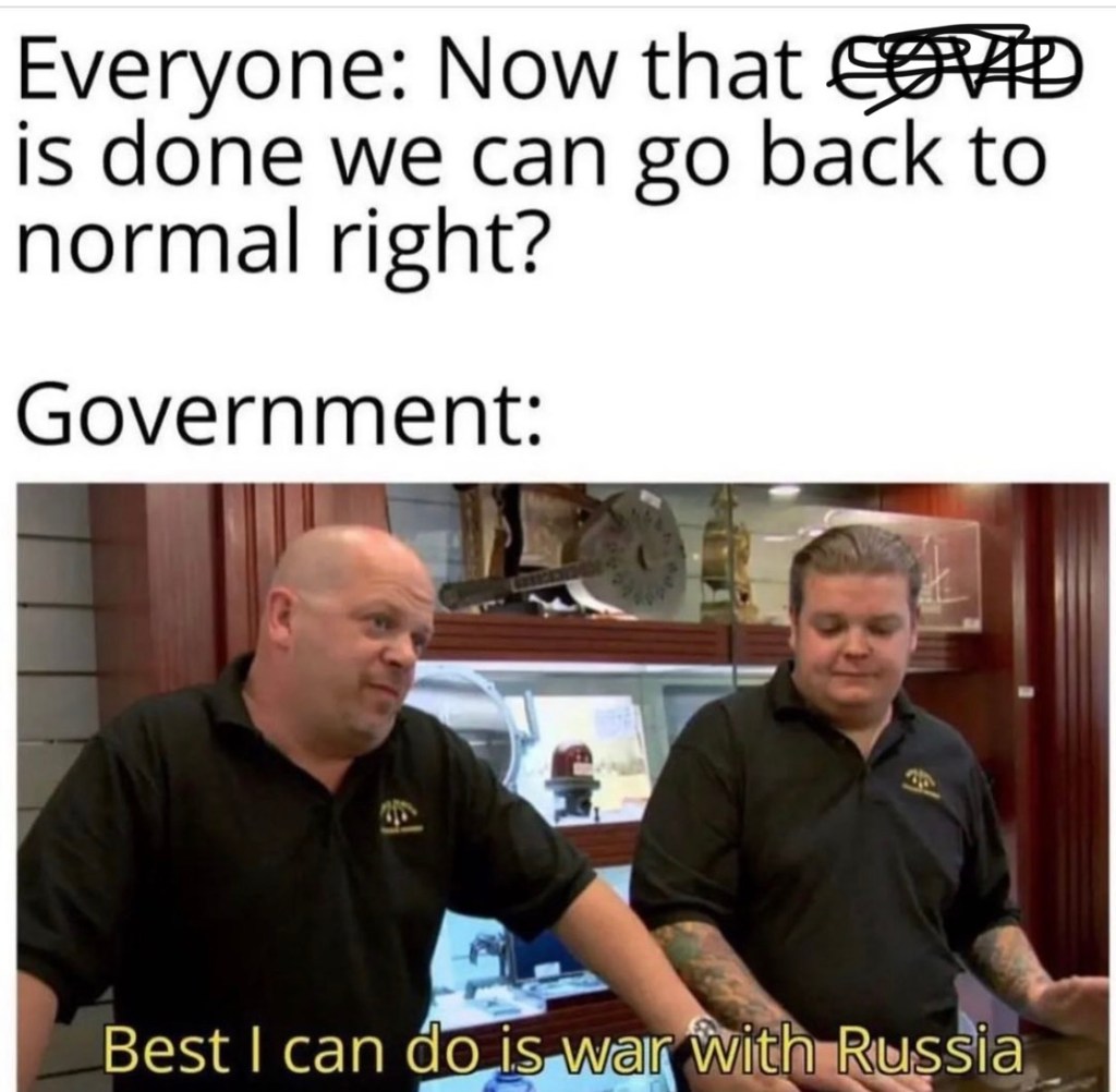 We’ll be told how we’re really hurting Putin by dumping all our vodka down the drain, even though we’re definitely still going to buy oil from Russia. It’s much greener when you have to ship it across an ocean. Jokes on you, Biden! I don’t drink vodka! Although, if we ever go to war with Kentucky, I’m screwed.